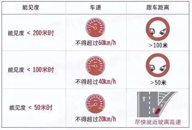 如能见度过低,应寻找最近的出口尽快驶离高速公路。如距离出口较远,可选择把车停靠在高速公路紧急停靠带上,打开雾灯、示廓灯和尾灯,并在来车方向150米以外设置警告标志。切记!车上人员一定要下车,到护栏外躲避。